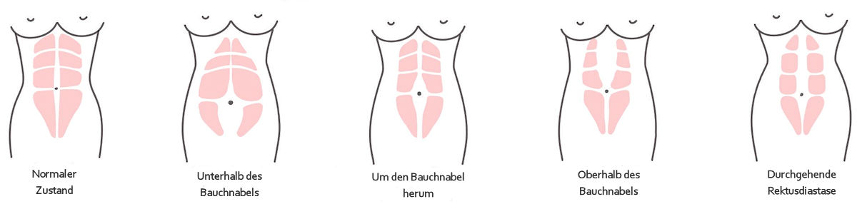 Es gibt verschiedene Arten der Rektusdiastase, wie man auf dem Bild gut sehen kann. Im Idealfall sind die Bauchmuskelbäuche ca. 0,6 cm voneinander entfernt und durch die Linea Alba in ihrer natürlichen Form miteinander verbunden. Verändert sich der Abstand der Muskelbäuche, spricht man von einer Diastase, die sich in unterschiedlicher Form abbilden kann.
